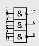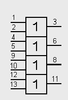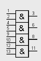 Назначения выводов 1,2,3,4,5,9,10,11,13 - входы 1 - 3 лог. элементов, 6,8,12 - выходы лог. элементов. К 14 - выводу подключается Uпит, а вывод 7 является общим.