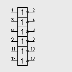 Назначения выводов 1,3,5,9,11,13 - входы 1 - 6 лог. элементов, 2,4,6,8,10,12 - выходы лог. элементов. К 14 - выводу подключается Uпит, а вывод 7 является общим.