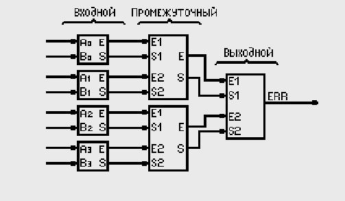 б) промежуточный блок - в этот блок поступают сигналы с входного блока, которые подвергаются сравнению и анализу, с выходов блока формируются сигналы, необходимые для формирования сигнала сообщающего о ошибке;