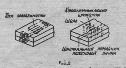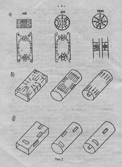 На рис.1,а приведены эпюры распределения электрического (сплошные линии) и магнитного (пунктирные) полей некоторых типов волн в фидерах, на рис.1,б - токи проводимости на внутренних поверхностях фидеров, на рис.1,в показано, как следует располагать щели с максимальной интенсивностью излучения (незаштрихованные) и неизлучающие (заштрихованные). На рис.2,а изображена электромагнитная волна в симметричной полосковой линии, а на рис.2,б - щелевой излучатель, прорезанный во внешнем проводнике этой линии. Наличие щелей вызывает появление в полосковой линии волн высших типов, для подавления которых используется комбинация короткозамыкающих штифтов.