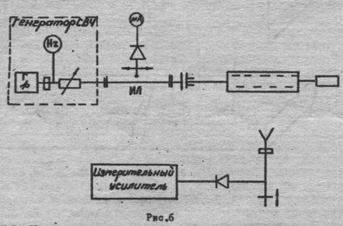 В установке используются генератор СВЧ Г4 - 32А, измерительная линия (ИЛ), вращающееся волноводное соединение (ВС), исследуемая передающая щелевая антенна, согласованная нагрузка, рупорная приемная антенна, детекторная головка и измерительный усилитель. К выходному фланцу вращающегося соединения с помощью набора волноводных элементов могут присоединяться различные щелевые антенны.