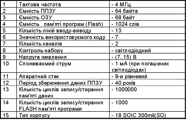 PIC16F84 - це 8-pазpядні мікроконтролери з RISC архітектурою, вироблені фірмою Microchip Technology. Це сімейство мікроконтролерів відрізняється низькою ціною, низьким енергоспоживанням і високою швидкістю. Мікроконтролери мають убудоване ЭППЗУ програми, ОЗУ даних і випускаються в 18 і 28 вивідних корпусах. Для налагодження програм і макетування випускається варіант контролерів з ультрафіолетовим стиранням. Ці контролери допускають велике число циклів запису/стирання і мають дуже малий час стирання ( звичайно 1-2 хвилини. Однак ціна таких контролерів істотно вище, ніж однократно програмувальних, тому їх невигідно встановлювати в серійну продукцію. Для виробів, програма яких може мінятися, або містить які-небудь перемінні частини, таблиці, параметри калібрування, ключі і т.д., випускається электрично стираємий і перепрограмувальний контролер PIC16F84. Він також містить электрично перепрограмувальне ПЗУ даних. Саме такий контролер я і використовував в своїй роботі. PIC16F84 відноситься до сімейства КМОП мікроконтролерів. Відрізняється тим, що має внутрішнє 1Kx14 біт EEPROM для програм, 8-бітові дані і 64-байт EEPROM пам'яті даних. При цьому відрізняються низькою вартістю і високою продуктивністю. Усі команди складаються з одного слова (шириною 14 біт) і виповнюються за один цикл (400 нс. при 10 Мгц), крім команд переходу, що виконуються за два цикли (800 нс.). PIC16F84 має переривання, що спрацьовують від чотирьох джерел, і восьмирівневий апаратний стік. Периферія містить у собі 8-бітний таймер/лічильник з 8-бітним програмувальним попереднім дільником (фактично 16 - бітний таймер) і 13 ліній двунаправленного введення/виводу. Висока навантажувальна здатність (25 мА макс. Струм, що втікає, 20 мА макс. струм, що випливає,) ліній введення/вивода спрощують зовнішні драйвери і, тим самим, зменшується загальна вартість системи. Розробки на базі контролерів PIC16F84 підтримується ассемблером, програмним симулятором, внутрисхемним емулятором (тільки фірми Microchip) і програматором. Серія PIC16F84 підходить для широкого спектра додатків від схем високошвидкісного керування автомобільними й електричними двигунами до економічних віддалених прийомопередатчиків, що показують приладів і зв'язних процесорів. Наявність ПЗУ дозволяє підбудовувати параметри |