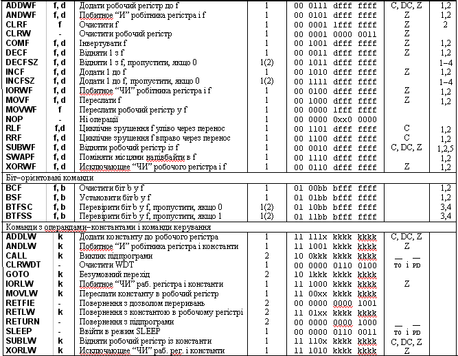 Позначення виводів мікроконтролера PIC 16F84 Варто додати, що убудований автомат програмування EEPROM кристала PIC16F84 дозволяє легко підбудовувати програму і дані під конкретні вимоги навіть після завершення ассемблювання і тестування. Ця можливість може бути використана як для тиражування, так і для занесення каліброваних даних уже після остаточного тестування.Кожна команда PIC16F84 - це 14-бітове слово, що розділене за змістом на наступні частини: поле коду операції OPCODE, поле для одного і більш операндов, що можуть брати участь чи ні в цій команді. Система команд PIC16F84 містить у собі байт(орієнтовані команди, біт(орієнтовані, операції з константами і команди передачі керування (Табл. 1). Для байт(орієнтованих команд 'f' позначає собою регістр, з яким провадиться дія; 'd' ( біт обумовлює, куди записати результат. Якщо 'd' = 0, то результат буде поміщений у W регістр, при 'd' = 1 результат буде поміщений у регістр 'f', згаданий у команді. Для біт(орієнтованих команд 'b' позначає номер біта, що участвуют у команді, а 'f' ( це регістр , у якому цей біт розташований. Для команд передачі керування й операцій з константами, 'к' позначає восьми чи одинадцятибітну константу. Усі команди виконуються протягом одного командного циклу. У двох випадках виконання команди займає два командних цикли: перевірка умови і перехід, зміна програмного лічильника як результат виконання команди. Один командний цикл складається з чотирьох періодів генератора. Таким чином, для генератора з частотою 4 Мгц час виконання командного циклу буде 1 мкс. Набір команд мікроконтролера PIC16F84 Таблиця 1 |