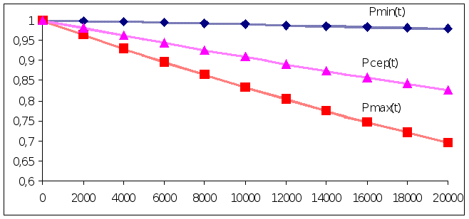 =10000 г: Pmin(t)=2.718 =12000 г: Pmin(t)=2.718 =14000 г: Pmin(t)=2.718 =16000 г: Pmin(t)=2.718 =18000 г: Pmin(t)=2.718 =20000 г: Pmin(t)=2.718 6.По одержаним значенням вірогідності безвідмовної роботи (Pmin(t), Pmax(t), Pсер(t)) будуємо графік безвідмовної роботи пристрою |