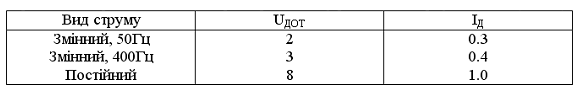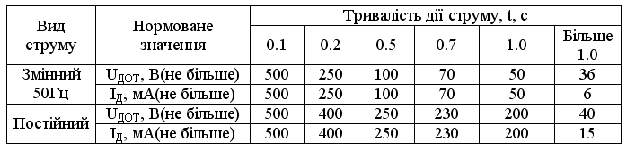 Для правильного визначення необхідних засобів та заходів захисту людей від ураження електричним струмом необхідно знати допустимі значення напруг доторкання та струмів, що проходять через тіло людини. Напруга доторкання – це напруга між двома точками електричного кола, до яких одночасно доторкнулася людина. Граничнодопустимі значення напруги доторкання та сили струму для нормального (безаварійного) та аварійного режимів електроустановок при проходженні струму через тіло людини по шляху “рука-рука” та “рука-нога” регламентуються ГОСТ 12.1.038-82 (табл.1 та 2). |