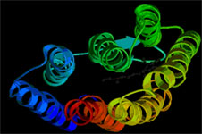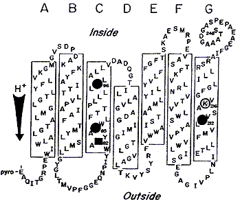Бактериородопсин - ретиналь-содержащий генератор протонного транспорта представляет собой трансмембранный белок в 248 аминокислот с молекулярным весом 26 кДа, пронизывающий мембрану в виде семи a