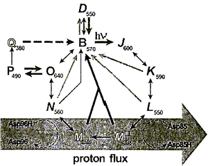 Индуцированный светом протонный транспорт сопровождается рядом циклических спектральных изменений БР, совокупность которых называется фотоциклом (рис.4). Тридцать лет исследований привели к довольно детальному пониманию фотоцикла, однако подробности протонного транспорта все еще изучаются.