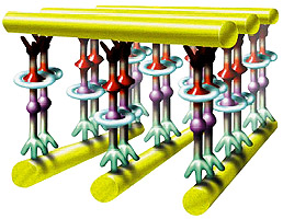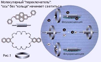 Им удалось насадить такую молекулу, имеющую форму кольца, на ось – линейную молекулу. Для того чтобы кольцо не соскакивало с оси, к ее концам присоединяются крупные молекулярные фрагменты, играющие роль "гаек" (в этом качестве использовались разнообразные донорные группы). При реакции с кислотой (Н+) или основанием (В) кольцо может скользить от одного конца оси к другому, "переключая" химическое состояние. Забавно, что в принципе на молекулярном уровне воссоздается механическое устройство, весьма похожее на соединение стержней и колесиков в первых, самых примитивных, вычислительных устройствах ХVII века (впрочем, при желании в этой молекулярной структуре можно углядеть и простейшие канцелярские счеты, с одной костяшкой на каждом прутике).