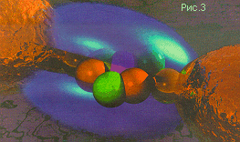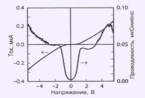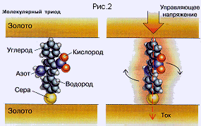 , (на рисунке выделены цветом). Такая асимметричная молекулярная конфигурация создает электронное облако сложной формы, в результате чего возникает удивительно красивый и принципиально важный для решения поставленной задачи физический эффект – при наложении поля молекула закручивается, ее сопротивление меняется, и она начинает пропускать ток (правая часть рисунка). При снятии поля молекула раскручивается в обратную сторону и возвращается в исходное состояние. Переключатель, созданный по этому принципу, представляет собой линейную цепочку из примерно 1000 молекул нитроаминобензолтиола, расположенную между двумя металлическими контактами. Более того, замеры с использованием туннельного микроскопирования (фрагмент молекулярной цепочки был впаян между сверхтонкими иглообразными золотыми электродами; геометрия эксперимента показана на рис. 3) позволили получить рабочие параметры переключателя, которые с полным правом можно назвать молекулярной вольт-амперной характеристикой и молекулярной проводимостью (рис.4). Кривая проводимости (которая, кстати, оказалась весьма близка к расчетной) имеет четко выраженный "провал". Это позволяет переводить участки молекулы из проводящего состояния в непроводящее, и наоборот, простым изменением приложенного напряжения. Формально и фактически получен (химик, конечно, предпочтет термин "синтезирован") молекулярный триод. Действительно, это можно считать первым этапом создания молекулярной электроники.