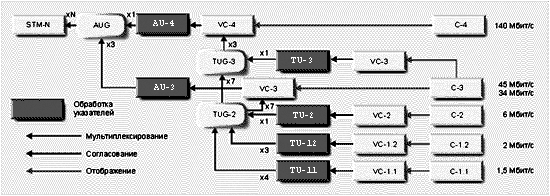 Административный блок (AU-n), где n=3 или n=4, состоит из VC-3 или VC-4 и указателя AU. Он обеспечивает сопряжение путей более высокого порядка и уровня секции с мультиплексированием. Значение указателя определяется согласованием фазы VC-n с кадром STM-1. Группа административных блоков (AUG) - группа AU c чередующимися байтами - занимает фиксированное положение в нагрузке STM-1. Синхронный транспортный модуль (STM-N) содержит n групп AUG c информацией SOH(Section Overhead), касающейся кадрирования, обслуживания и работы. N групп AUG чередуются через один байт и находятся в фиксированном положении по отношению к STM-N.