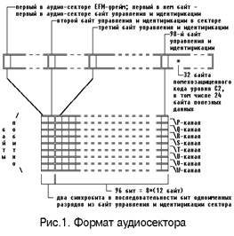 Самым мелким (и на сегодня независимым от типа диска) элементом формата служит EFM-фрейм (Eight to Fourteen Modulation - кодирование 8 в 14). Он содержит 33 байта: первый байт - управления и идентификации - и 32 байта, полученных путем помехоустойчивого кодирования 24 полезных байтов данных (см. рис. 1). 98 таких фреймов собирают вместе и образуют аудио-сектор, содержащий 24*98=2352 байта данных и 98 байтов управления и идентификации.