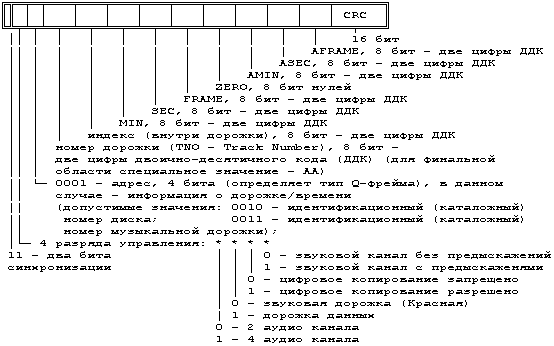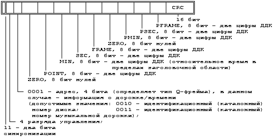 Фреймы подканала образуют основной механизм хранения служебной информации, как то: идентификационные номера диска и дорожки, номер дорожки на диске, временные параметры отдельных фрагментов записи и т.д. P-фрейм используется для хранения флажков паузы, которые имеются, в частности, между музыкальными фрагментами. Этот фрейм подканала предназначался для самых простых аудио-проигрывателей, устройство управления которых не обладало достаточным быстродействием для реализации других механизмов поиска требуемого фрагмента. Фреймы подканалов от R до W могут использоваться различными приложениями, в частности, для вывода текста на "экран" одновременно со звуком или для выдачи команд MIDI (musical instrument digital interface) - цифрового интерфейса управления музыкальными инструментами. К более подробному рассмотрению структуры Q-фрейма подканала мы вернемся позже.