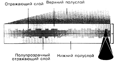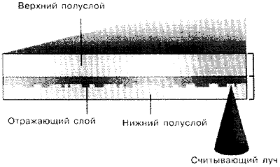 DVD может существовать в нескольких модификациях. Самая простая из них похожа на обычный диск, отличающийся только тем, что отражающий слой расположен не на составляющем почти полную толщину (1.2 мм) слое поликарбоната, а на слое половинной толщины (0.6 мм). Вторую половину составляет плоский верхний слой (рис. 10). При этом емкость такого диска достигает 4.7 Гбайт, что обеспечивает более двух часов видео телевизионного качества (компрессия MPEG-2). При этом без особого труда на диске могут дополнительно сохраняться высококачественный стереозвук (на нескольких языках!) и титры (также многоязычные). Если оба слоя несут информацию (в этом случае нижнее отражающее покрытие полупрозрачное - рис. 11), то суммарная емкость составляет 8.5 Гбайт (некоторое уменьшение емкости каждого слоя вызывается необходимостью уменьшить взаимные помехи при считывании дальнего слоя). Toshiba и Time Warner предлагают использовать также двухсторонний двухслойный диск. В этом случае его емкость составит 17 Гбайт!