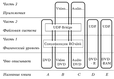 Как и стандарты на CD требования к DVD изложены в «книгах». Но в отличии от уже знакомых нам «цветных книг» эти - «упорядочены в алфавитном порядке». В настоящий момент обсуждаются пять книг от «A» до «E». Книга может содержать до трех частей (рис. 14). При этом в первой части описываются физические спецификации, во второй - файловая система, а в третей - приложения. Первые три книги описывают соответственно ROM, Video и Audio DVD. При этом они используют одинаковый физический формат носителя, изготавливаемого «штамповкой» и файловую систему. Файловая система этих стандартов - переходная (UDF-Bridge), обеспечивающая комбинацию возможностей уже знакомой пользователям CD-ROM файловой системы ISO-9660 и реализующей рекомендации ISO/IEC 13346 новой системы, разработанной Optical Storage Technology Association (OSTA) и получившей название Universal Disk Format - UDF. Два других стандарта D и E описывают записываемые (DVD-R (recordable) или иначе DVD-WO (write once)) и перезаписываемые (DVD-RAM, DVD-W (writable) или иначе DVD-E (erasable)) диски. Да-да! В отличие от CD диски DVD рождаются сразу с возможностью записи и даже перезаписи информации. Однако эти стандарты наименее устоявшиеся, ещё стоит отметить что формат файлов и для тех и для других предполагается UDF.