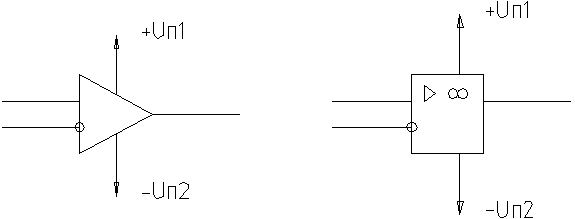 Питание ОУ осуществляется, как правило, от двух разнополярных источников питания одинакового напряжения. Условное обозначение ОУ представлено на рис. 1.