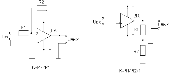 Наиболее типичные схемы усилителя на базе ОУ имеют вид, представленный на рис. 2. Коэффициенты усиления таких усилителей определяются параметрами цепи ООС и формулы для их вычисления приведены на рисунке.