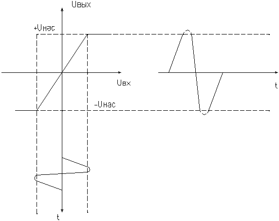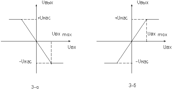 Амплитудные передаточные характеристики инвертирующего и неинвертирующего усилителей с обратной связью представлены на рис. 3. (соответственно 3-а и 3-б ).
