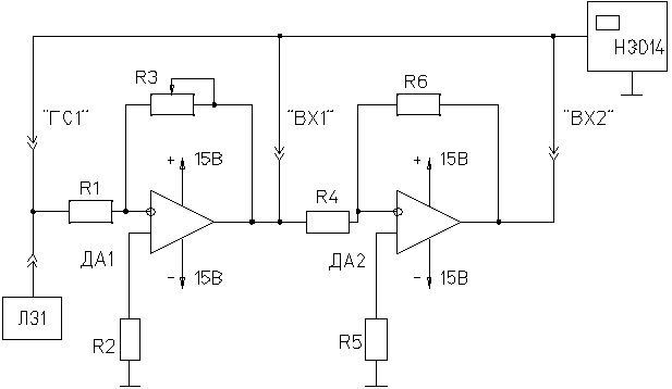 3.1. Предметом исследования в настоящей лабораторной работе является двухкаскадный усилитель, собранный на ОУ - микросхемах ДА1 и ДА2 — К 140УД8А.