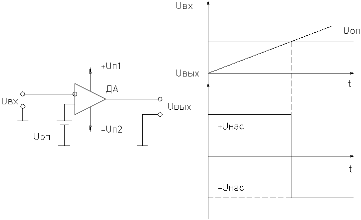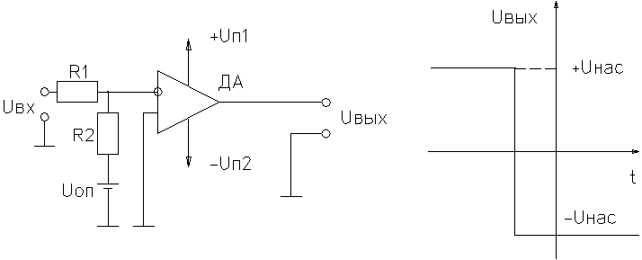 2.2.1. При включении питания в силу действия положительной обратной связи в схеме происходит лавинообразный процесс, в результате которого напряжение на выходе ОУ устанавливается на уровне напряжения насыщения положительной или отрицательной полярности. Пусть, например, в момент времени t=0 установилось напряжение +Uнас .