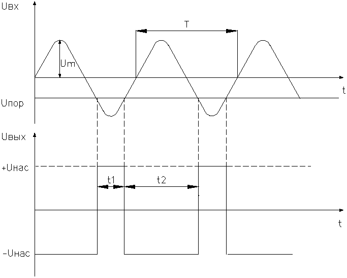 Как только возрастающее напряжение на конденсаторе Uc достигнет этого значения, произойдет лавинообразный процесс, приводящий к “опрокидыванию” мультивибратора и установлению на его выходе напряжения -Uнас — момент времени t1 .