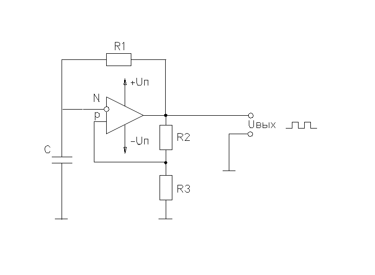 Представленный генератор представляет собой операционный усилитель ОУ — ДА, охваченный положительной обратной связью через цепь R2 — R3. С другой стороны, эту схему можно охарактеризовать исходя из того, что ОУ — ДА с резисторами R2 — R3 представляют регенеративный компаратор, так называемый триггер Шмидта, охваченный ООС по цепи R1 — C.