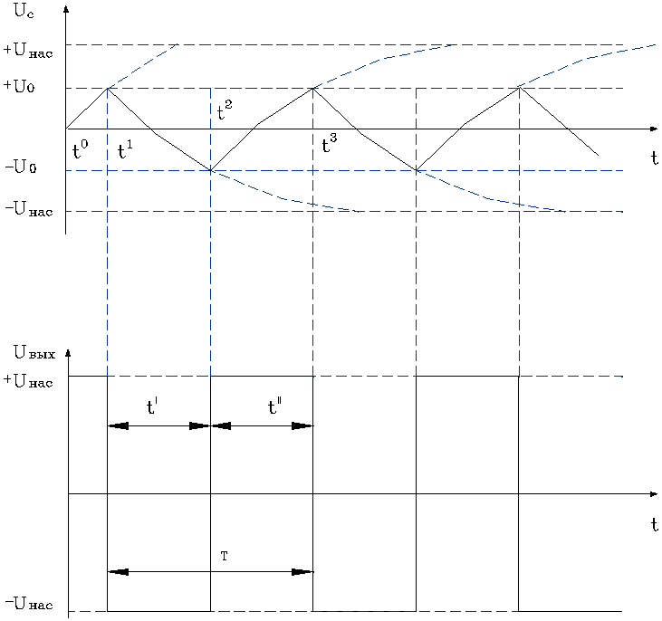 2.2.5. На этом отрезке времени на входе “Р” ОУ действует уже отрицательное напряжение U0 , определяемое соотношением (1). Как только напряжение на конденсаторе достигнет этого значения, произойдет очередное “опрокидывание” мультивибратора и на его выходе устанавливается напряжение +Uнас (момент t2).