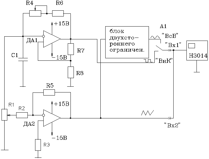 Усиленный сигнал треугольной формы подается для наблюдения на контрольную точку, обозначенную символом “Вх2”.