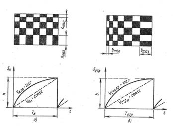 Геометрические искажения возникают также из-за неидентичности относительных скоростей движения лучей передающей и приемной трубок по вертикали или (и) горизонтали. Практически это чаще всего происходит при нарушении на одной из сторон условия постоянства скоростей движения луча по вертикали или (и) горизонтали vKCTf (t) = var, т.е. из-за нелинейности токов кадровой или (и) строчной развертки. В этом случае геометрические искажения в вертикальном и горизонтальном направлениях соответственно изображены на (рис. 2.2, а,б)