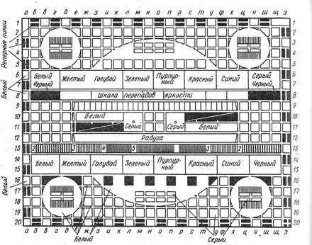 Цветовые искажения оцениваются по качеству воспроизведения специальных электрических испытательных сигналов, имитирующих опорные цвета. Например, широко используются сигналы, формируемые специальным генератором цветных вертикальных полос (ГЦП), с помощью которых на экране кинескопа воспроизводится восемь наиболее важных цветов: белый, желтый, голубой, пурпурный, красны| й, синий и черный (см. рис.2.5). Подобные две цветовые шкалы с разной насыщенностью использованы для визуальной оценки верности цветопередачи и в УЭИТ.