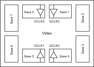 — четыре глобальные сети распределения тактовых сигналов с малыми разбегами фронтов, плюс 24 локальные тактовые сети.