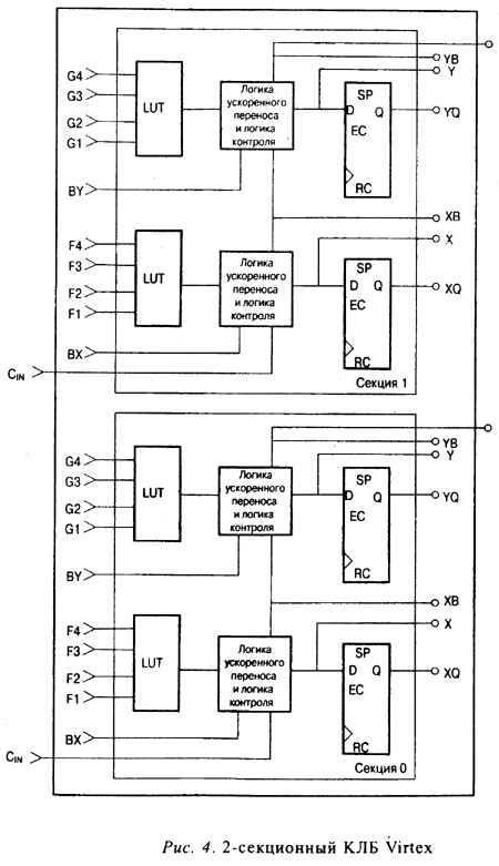 — на базе 4-входовых таблиц преобразования (4-LUT - - Look-UpTable), конфигурируемых либо как 16-битовое ОЗУ (RandomAccessMemory), либо как 16-разрядный сдвиговый регистр;