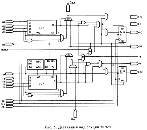 Основными особенностями архитектуры кристаллов семейства Virtex являются гибкость и регулярность. Кристаллы состоят из матрицы КЛБ (Конфигурируемый Логический Блок), которая окружена программируемыми блоками ввода-вывода (БВВ). Все соединения между основными элементами (КЛБ, БВВ) осуществляются с помощью набора иерархических высокоскоростных программируемых трассировочных ресурсов. Изобилие таких ресурсов позволяет реализовывать на кристалле семейства Virtex даже самые громоздкие и сложные проекты.