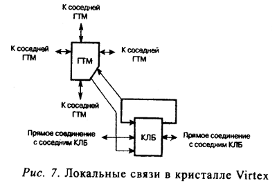 Программируемая пользователем вентильная матрицу серии Virtex показана на Рис. I . Соединение между КЛБ осуществляется с помощью главных трассировочных матриц — ГТМ. ГТМ — это матрица программируемых транзисторных двунаправленных переключателей, расположенных на пересечении горизонтальных и вертикальных линий связи. Каждый КЛБ окружен локальными линиями связи (VersaBlock™), которые позволяют осуществить соединения с матрицей ГТМ.