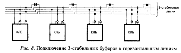 • Буферы с тремя состояниями (BUFT), которые расположены вблизи каждого КЛБ и управляют горизонтальными сегментированными трассами.