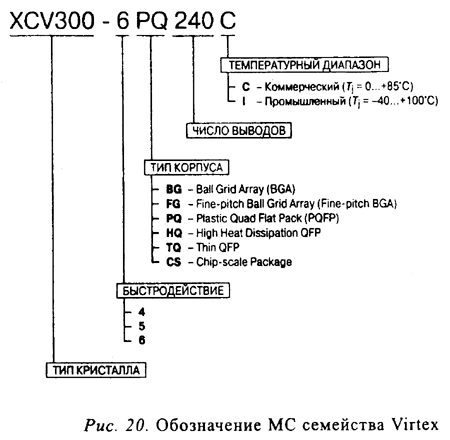 Способ обозначения микросхем семейства Virtex показан на Рис. 20.