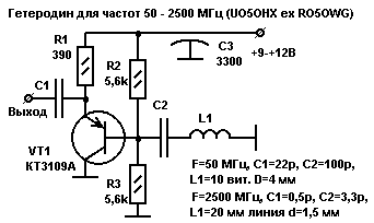 В качестве гетеродина выберем схему, устойчиво генерирующую на частотах от 50 до 2500 МГц. Причем изменяются только элементы контура и связи [11]. Принципиальная электрическая схема представлена на Рисунок 21.