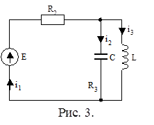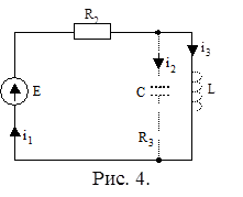 5. Определяем производные свободных токов и напряжений в момент времени непосредственно после коммутации (t = 0+), для чего составим систему уравнений, используя законы Кирхгофа для схемы, изображенной на рис. 3, положив Е = 0.