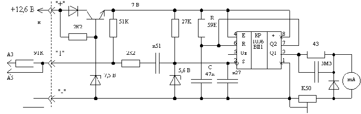 Схема №1 – простой аналоговый велоодометр, собранный на ждущем мультивибраторе (ЖМВ) на микросхеме КР1006ВИ1