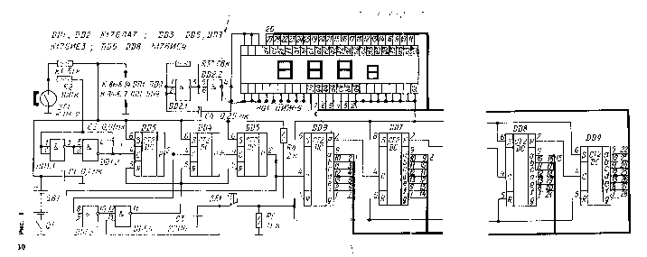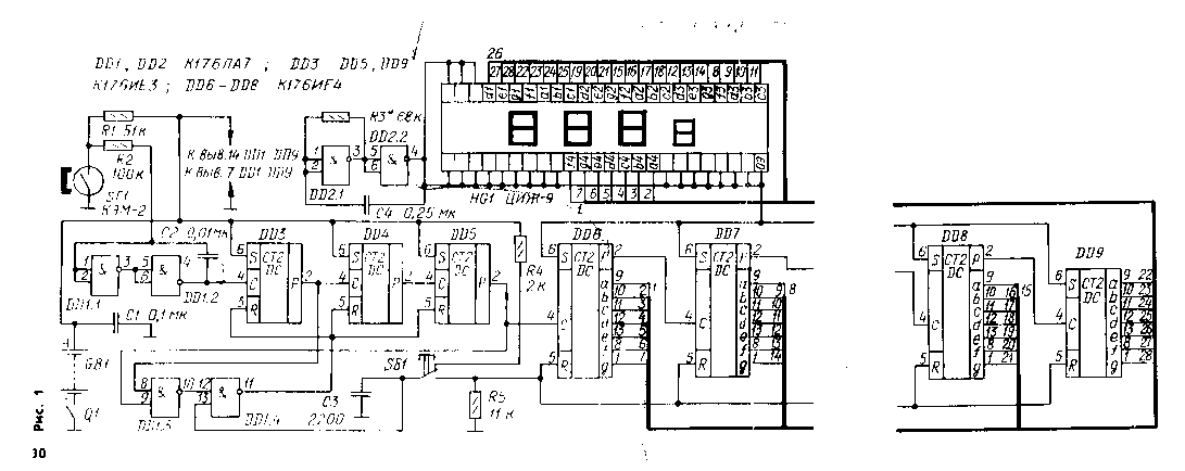 Отрицательные перепады на выходе делителя переключают триггеры счетчика пути (DD6 — DD9). Выходы дешифраторов указанных микросхем соединены с входами индикатора HG1.