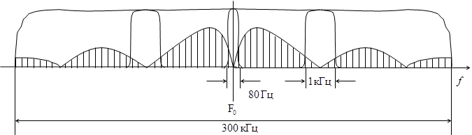 · Высокочастотный преобразователь приемного тракта должен пропустить достаточное число полезных компонент сигнала, т.е. иметь полосу не менее ±12F Т, к этому надо добавить нестабильность несущей (±10 кГц). Следовательно, полоса должна быть порядка 2(142+±10) кГц= =300 кГц. Эта же величина определяет занимаемый радиолинией диапазон частот.