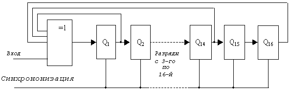 Для реализации циклического избыточного контроля применяется 16-битный регистр сдвига, на вход которого подается контролируемый двоичный набор B(X), а из соответствующих разрядов регистра сдвига берутся сигналы обратной связи. Входной сигнал и все сигналы обратной связи суммируются по mod 2 (операция исключающего ИЛИ), в результате чего получается линейная последовательностная схема, так как сумматор по mod 2 придает один и тот же вес каждому входному биту. Полином называется характеристическим полиномом генератора, а фактические точки отводов обратной связи находятся из его инверсии. Инверсное (или обратное ) выражение находится путем вычитания каждого члена в характеристическом полиноме из X16 в случае кода ЦИК-16, что дает выражение обратной связи X16 + X14 + X1 + 1. Следовательно, в элемент исключающего ИЛИ подаются входной сигнал и отводы от первого, четырнадцатого и шестнадцатого разрядов регистра сдвига (рис. 1).