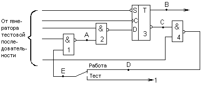 Поясним это на примере схемы, изображенной на рис. 2. Допустим, что нисправная ИМС 2. Это приводит к появлению неправильной сигнатуры на выходе схемы Т, причем на всех входах схемы сигнатуры правильные, а в точках A, B, C и D – неправильные. Указать, какой из четырех элементов схемы вышел из строя, невозможно, так как нет ни одного элемента, у которого при неправильной выходной сигнатуре были бы правильные все входные. Если снабдить схему переключателем П1 , который в режиме тестирования размыкает цепь обратной связи, сигнатура в точке E перестает зависить от сигнатуры в точке D, и в этом случае неисправность ИМС 2 легко обнаруживается.