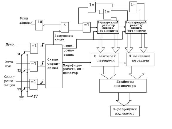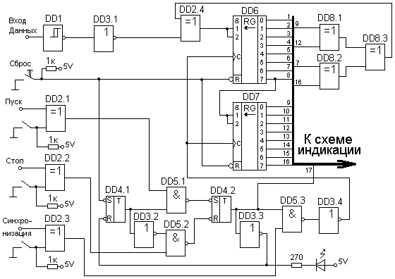 Схема управления выполнена на двух RS- триггерах, трех 2-х входовых элементах И-НЕ и двух инверторах. Сигналом сброса схема управления запрещает прохождения сигнала синхронизации на сдвиговые регистры и подготавливается к приему сигнала пуска. После прихода сигнала пуска, схема управления начинает пропускать сигналы синхронизации на сдвиговые регистры и подготавливается к приему сигнала останова. После прихода сигнала останова, снова блокируется прохождение сигналов синхронизации на сдвиговый регистр, при этом на индикаторах отображается информация полученная в сдвиговом регистре.