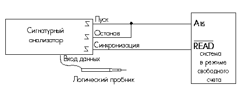 Предположим, что исследуется система с 8-битным микропроцессором, имеющим 16-битную шину адреса. В цикле свободного счета на шине адреса возникают все двоичные наборы, которые циклически повторяются. Благодаря периодичности такой тип активности идеально подходит для сигнатурного анализа. На старшей линии A15 шины адреса действует низкий уровень для одной половины всех адресов и высокий для другой половины. Следовательно, между соседними нарастающими фронтами сигнала на линии A15 находится один полный цикл шины адреса. Сигнал с этой линии можно использовать как сигналы пуска и останова анализатора. Первый из них осуществляет запуск, а второй - останов. Остаток, образованный в регистре сдвига между этими событиями, подается на индикатор в качестве сигнатуры проверяемого узла. В режиме свободного счета все команды осуществляют считывание из памяти, и сигналы для анализатора можно взять с линии READ. Анализатор настраивается на нарастающие фронты входов пуска, останова и синхронизации, поэтому данные синхронно проходят через регистр сдвига по заднему фронту сигнала READ в течении одного полного цикла шины адреса. Необходимы подключения показаны на рис. 6.