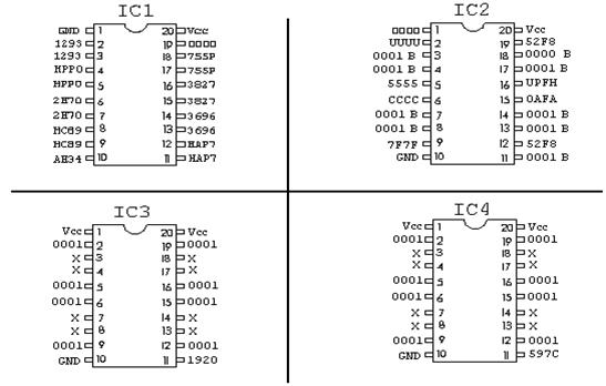 Далее в документе находятся диаграммы разводки выводов всех микросхем, и у каждого вывода показана его сигнатура. Земля всегда имеет характеристическую сигнатуру 0000, которая приводится как GND. Чтобы показать, что сигнатура 0000 допустима для вывода и “отличается” от сигнатуры земли, после сигнатуры находится буква B. Она показывает, что светодиод, находящийся в зонде логического пробника, при взятии сигнатуры будет вспыхивать. Примером служит сигнатура у вывода 18 микросхемы IC2. В режиме свободного счета сигнатуры не многих вывода ИС не имеют смысла и показываются на диаграммах в виде X (см. пример у вывода 3 IC4). Еще одна часто встречающаяся ситуация отражена у вывода 1 IC2. Здесь сигнатура равна 0000, но светодиод в зонде пробника не вспыхивает. Вывод 1 в данном тесте всегда имеет уровень логического 0, который дает такую же сигнатуру, как и земля; указание 0000 на диаграмме подчеркивает, что вывод не закорочен на землю. Если вывод закорочен на землю, следует указывать GND.