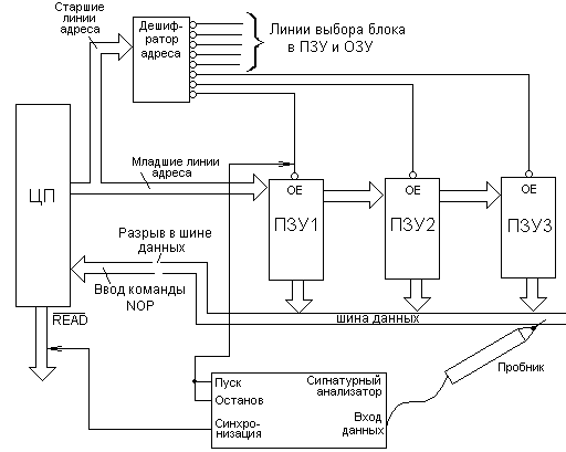 Для проверки тех частей системы, которые недоступны режиму свободного счета, необходимо написать и выполнить специальные программы. Каждая из них предназначена для проверки одной части системы, например входного порта, и обычно состоит всего из нескольких строк ассемблерного кода. Такие тест-программы сигнатурного анализа обычно помещаются в ПЗУ, которое находится в системе, но при нормальной работе не используется. Тест-ПЗУ приводится в действие либо переключением линии OE от первого системного ПЗУ с последующим сбросом системы, либо вводом в процессор команды RESTART и размещением тест-ПЗУ по адресу рестарта. Набор тест-программ обычно организован как цикл, который переодически выполняется при включении тест-ПЗУ в работу. В начале полного тест-цикла предусматривается формирование импульса на линии сигнала пуска сигнатурного анализатора, а в конце тест-цикла формируется импульс на линии сигнала останова анализатора. Часто для обоих сигналов пуска и останова используется одна и та же линия, что устраняет необходимость формирования отдельного сигнала останова. В микропроцессорах типа 8080/Z80 в качестве сигнала пуска-останова обычно применяется старшая линия А15 шины адреса, а само формирование сигнала осуществляется фиктивной командой ввода или вывода. В этих микропроцессорах адреса портов ВВ формируются только в младьшей половине шины адреса, но адрес дублируется и на старшей половине шины. Поэтому считывание или запись в порт ВВ с адресом 8016 вызовет появление импульса на линии А15 .