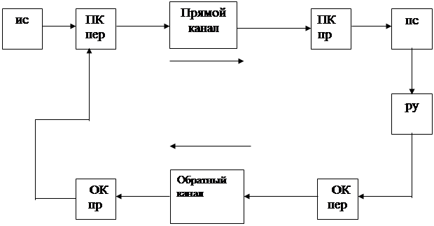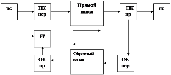 А) – с РОС; Б) – с ИОС; ПКпер – передатчик прямого канала; ПКпр – приемник прямого канала; ОКпер – передатчик обратного канала; ОКпер – приемник обратного канала; РУ – решающее устройство.