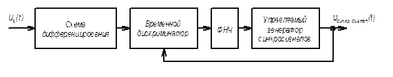 , образуется последовательность импульсов, временное положение которых соответствует границам между соседними символами «1» и «0». Эта последовательность поступает на временной дискриминатор, который вырабатывает управляющее напряжение, пропорциональное временнóму рассогласованию между входной и опорной последовательностью импульсов. Последняя и используется в качестве сигналов посимвольной (тактовой) синхронизации. Опорная последовательность вырабатывается генератором синхронизирующих сигналов. С помощью управляющего напряжения изменяется частота следования импульсов опорной последовательности, тем самым обеспечивается автоматическая подстройка генератора синхронизирующих сигналов.