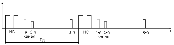 В системе организована канальная синхронизация. То есть, в начале каждого цикла передачи информации (первый канальный интервал) передается 2 одинаковых ИС. Кадровое синхрослово по своей структуре должно существенно отличаться от всех возможных кодовых комбинаций, поэтому необходимыми требованиями к синхросигналу являются: энергия больше энергии, передаваемой в информационном канале, а так же чтобы его форма не повторяла форму сигнала [3].