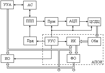 Как было отмечено выше, на ЦП используется импульсный режим излучения, поэтому в момент окончания очередного зондирующего радиоимпульса (ЗИ) антенна переключается от передатчика (Прд) к приемнику (Прм) и используется для приема до начала генерации следующего зондирующего радиоимпульса, после чего антенна снова подключается к передатчику и т.д. Эта операция выполняется переключателем прием-передача (ППП). Пусковые импульсы, задающие период повторения зондирующих сигналов и синхронизирующие работу всех подсистем ЦП, генерирует устройство управления и синхронизации (УУС), от которого зависит также вся логика работы. Сигнал с Прм после цифрового устройства селекции движущихся целей (ЦСДЦ) поступает на аппаратуру первичной обработки информации (АПОИ), где выполняется обнаружение сигнала и измерение координат (ИК) объекта. Окончательно отметки целей формируются в устройстве ФО. Сформированные сигналы вместе с информацией об угловом положении антенны передаются для дальнейшей обработки, а также для контроля на индикатор обзора (ИО).